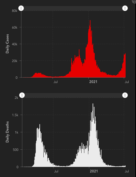 Estamos ante un clásico dilema del prisionero, pero de masas: si la mayoría se vacuna, ya no es vital vacunarse uno, y entonces que se vacunen los otros, mirá si al final pasa que a los tres años de aplicada la vacuna te empieza a gustar el cine iraní. El tema es que cuanta menos gente esté vacunada, más fácil se seguirá propagando la enfermedad (aunque ya no se sature el sistema sanitario, que no es poco) y así es como llegamos a la variante Delta que se está diseminando por Reino Unido como si fuera invierno y coso (por suerte las muertes no crecen *tanto*). Finalmente no hace diferencia lo que hagan dos personas así que como vean, pero un poco flojo sí que es no vacunarse. Lo mismo la variante Delta no salió de UK sino de la India, nocierto, así que hay que vacunar en todo el planeta, que los pobres contagian igual que los ricos.