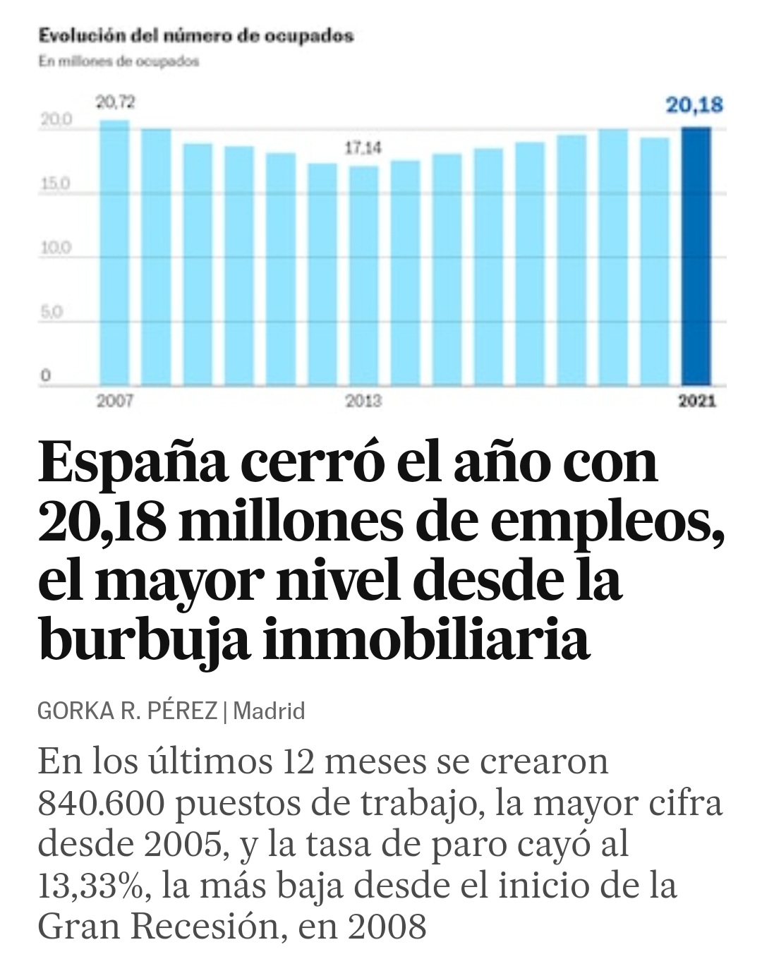Me sorprende lo bien que va el desempleo. Es verdad que hay poco paro comparado con la crisis post 2008, y parece que el bache por el covid se remonta, pero vaya, no entiendo muy bien por qué mejoramos, si todo lo seguimos haciendo igual de mal, sueldos precarios, no se venden coches, no hay chips, amenaza de guerra en Ucrania, inflación alta, que si vam a subir los tipos de interés... No sé, ¿qué tira de la economía española? ¿Los fondos europeos? ¿Burbuja inmobiliaria 2.0?