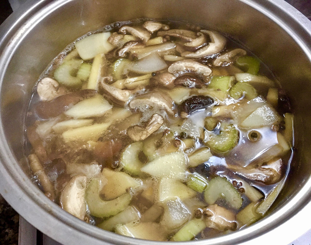 Un puñado de setas shiitake deshidratadas, dos cucharadas de salsa de soja, romero en polvo, unos cuantos granos de pimienta y otros cuantos de pimienta de Sichuan y unas hojas de salvia, jengibre, dos dientes de ajo y una bolsa de preparado de las que venden en el Consum, que lleva zanahorias, apio, chirimía, nabo y colinabo.