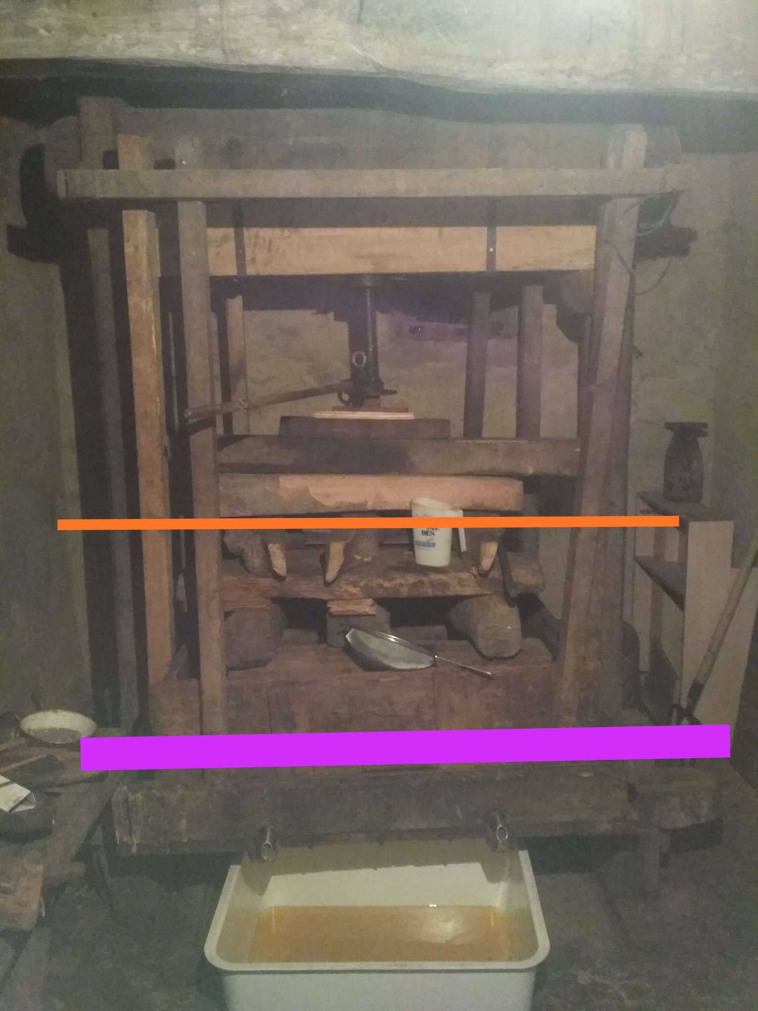 Media tonelada de manzana aproximadamente. La línea naranja era donde empezó, la morada es donde está la prensa tras una semana. El resultado son unos 400 litros de sidra dulce.
