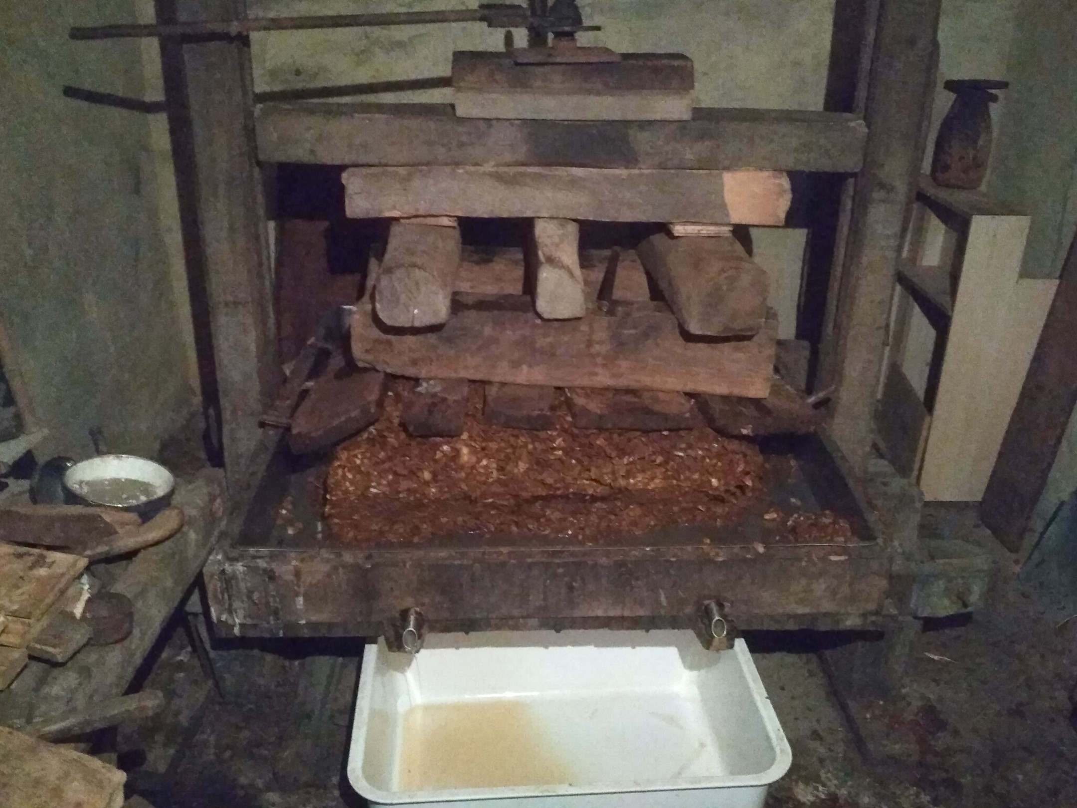 Además no es como hacer zumo con un exprimidor. Esto va todo a una prensa, cada día se abre, se "desprensa" y vuelve a prensar para que cambie de posición y de más sidra, y así durante una semana.