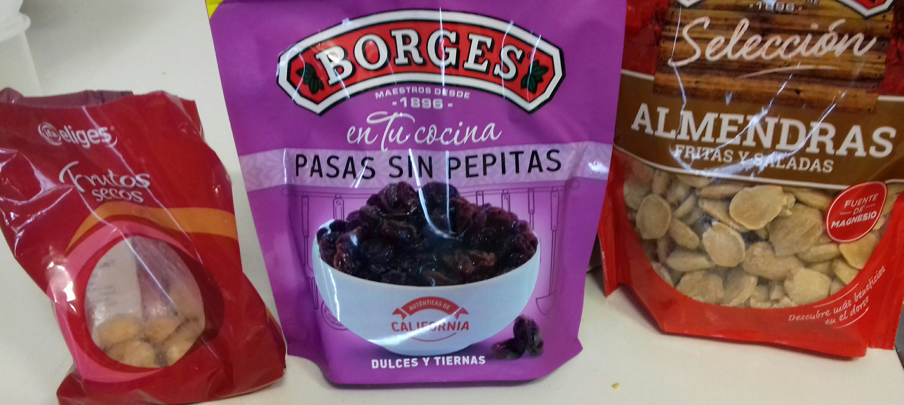 Cogemos mezcla de frutos secos: almendras y nueces de Macadamia, en este caso. Pasas sin pepitas las usaremos luego.