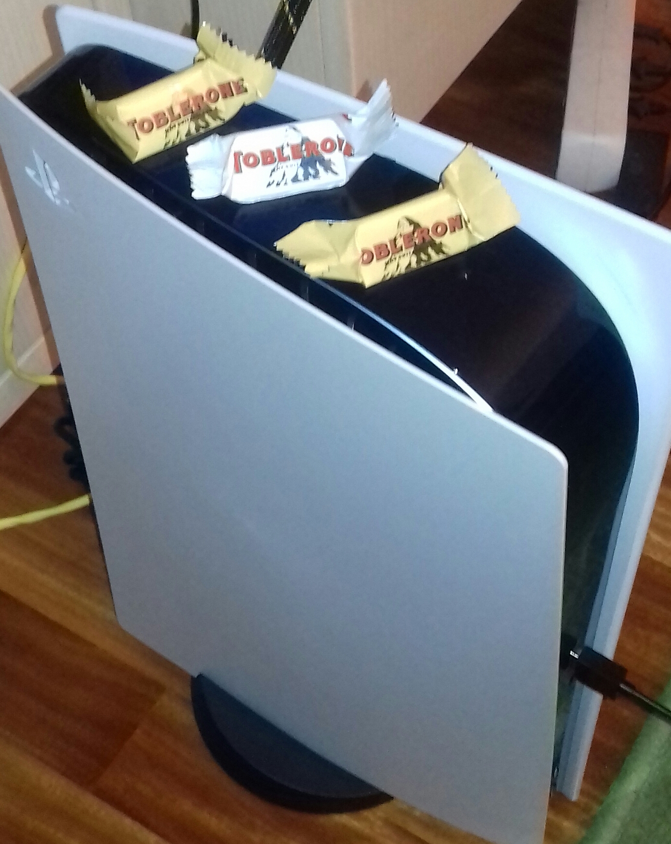 Para quienes no confiaron en mí, ahí va la foto: mini Toblerones interracial copulando con la PS5.