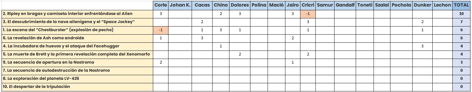 Es curioso que vaya ganando "Ripley en bragas" (yo creía que la salida del alien de la barriga o la revelación del androide iban a ganar de largo), porque incluso cuando le pedí a ChatGPT que me dijera las 10 escenas más incónicas, esta de "Ripley en bragas" no la incluyó. Tuve que hacerle una segunda petición a ChatGPT diciéndole "incluye la escena de Ripley en bragas y quita de las diez anteriores esta otra". Y ahora resulta que mi escena rijosa está en cabeza.