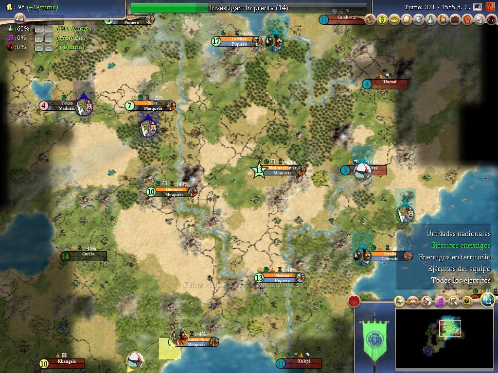 *331: Oye, que me equivoque antes con lso zulus, que no es una catapulta, que son 11, nos han dejado a un precioso 6%. En el norte el mosquetero de tokio ha caido, y el caballero frances ha resistido un ataque al 70%, por suerte nuestro camello pudo retirarse a timepo. Un trbajador que no pudo llegar a timepo a Nara ha caido ante los franceses, otro de sus caballeros está frente a la ciudad. En medinantonier el soldado con ahhca logró rechazar el ataque del caballero maya, esta libre de peligro por ahora, en Medina el granadero maya se ha cargado un saetero, por suerte ha quedado debil y un camello ha dado cuenta de el. Tres unidades se acercan a la meca pero espero que aguanten. Damasco ha terminado el mercado y le he puesto a ahcer mosqueteros.