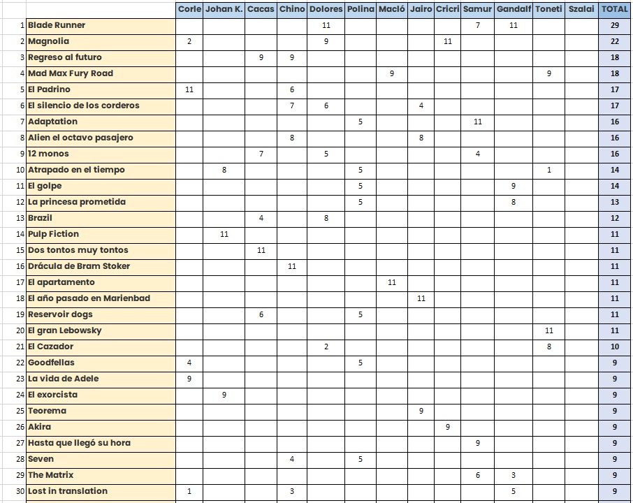 A destacar que el gusto ochentero de @Chino (ver su FilmAffinity es como volver a la juventud) le lleva a ser el que más pelis tiene entre las 30 primeras. Chino es el mainstream. Szalai es el lado opuesto del espejo, ni una sola ha clasificado de momento (entre otras cosas por su negativa a ordenar). Shame on you.