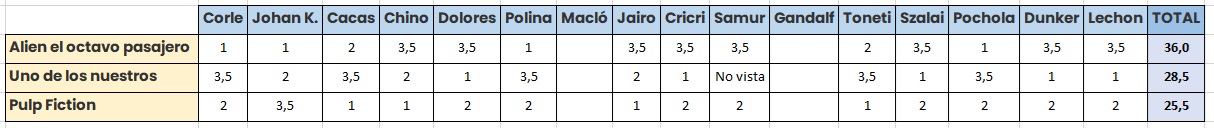 No he visto Uno de los nuestros, así que por lógica (la lógica que rige esta votación marciana) la voto como la mejor. Seguda Alien, porque es muy chula y sale un gato naranjoso. Y la última Pulp Fiction, que me parece mejor que Alien, pero como descubrí la semana pasada que a Tarantino le mola todo lo que Israel está haciendo en Gaza, no me da la gana de separar el personaje de la obra y lo mando a tomar por culo. Si ya me caía cada vez más gordo, ahora ya lo defenestro en mi escala de aprecio cinéfilo.