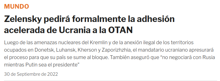 Ojo, que lo ha pedido después de que Putin se haya anexionado medio país tras poner como excusa "es que Ucrania iba a ser OTAN". Pues nada, pa eso yo soy Zelensky y lo pido, total de perdidos al rio.