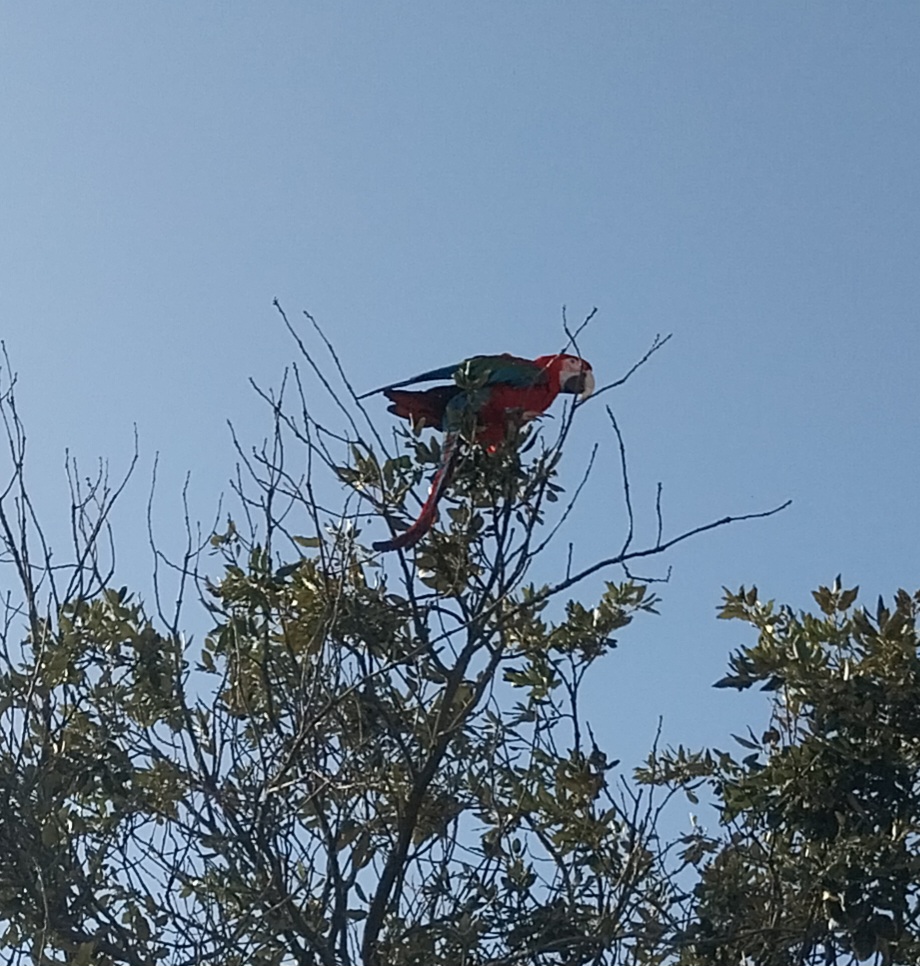 Un puto guacamayo enorme y colorido en un árbol de mi pueblo. Lo he visto llegar volando y he flipado. ¿A qué subnormal se le habrá escapado?