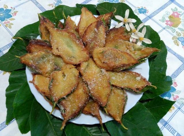 Hojas tiernas de limonero rebozadas en masa dulce con sabor a limón, se fríen y luego se espolvorean con azúcar (la hoja no se come).