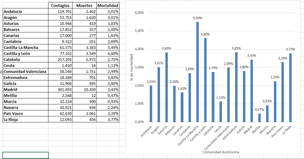 El Gobierno ha dado hoy datos oficiales de contagios con PCR y muertes con PCR y la diferencia de % de mortalidad (muertos entre contagiados) es más que notable de unas comunidades a otras. Algunas tienen un % de mortalidad menor al 1% (Murcia) y otras tienen un % de mortalidad más de 5 veces superior (Castilla-La Mancha).