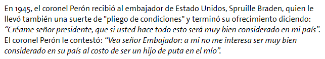 Es fácil gobernar cuando para los medios y para los gobiernos extranjeros sos un rockstar. El tema es que te quieren porque les malvendés el país, nocierto.Dolordebarriga escribió: ↑15 Feb 2021 00:28Vaya pollo el Menem. Diez años lo tuvisteis de presidente.Doctor Beaker escribió: ↑14 Feb 2021 19:53 bradenperon.png