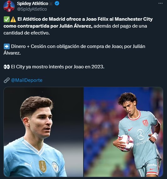 Por cierto, desde cuentas de seguidores atléticos se está alertando del lavado de imagen periodístico que varios gacetilleros y medios afines al Dúo Prescrito están realizando con Joao Félix. Parece ser que desde el club se desliza la idea de que, ante la muy improbable posibilidad de que salga cedido o vendido, nos lo vayamos a comer esta temporada, y por lo tanto conviene rebajar la tensión.