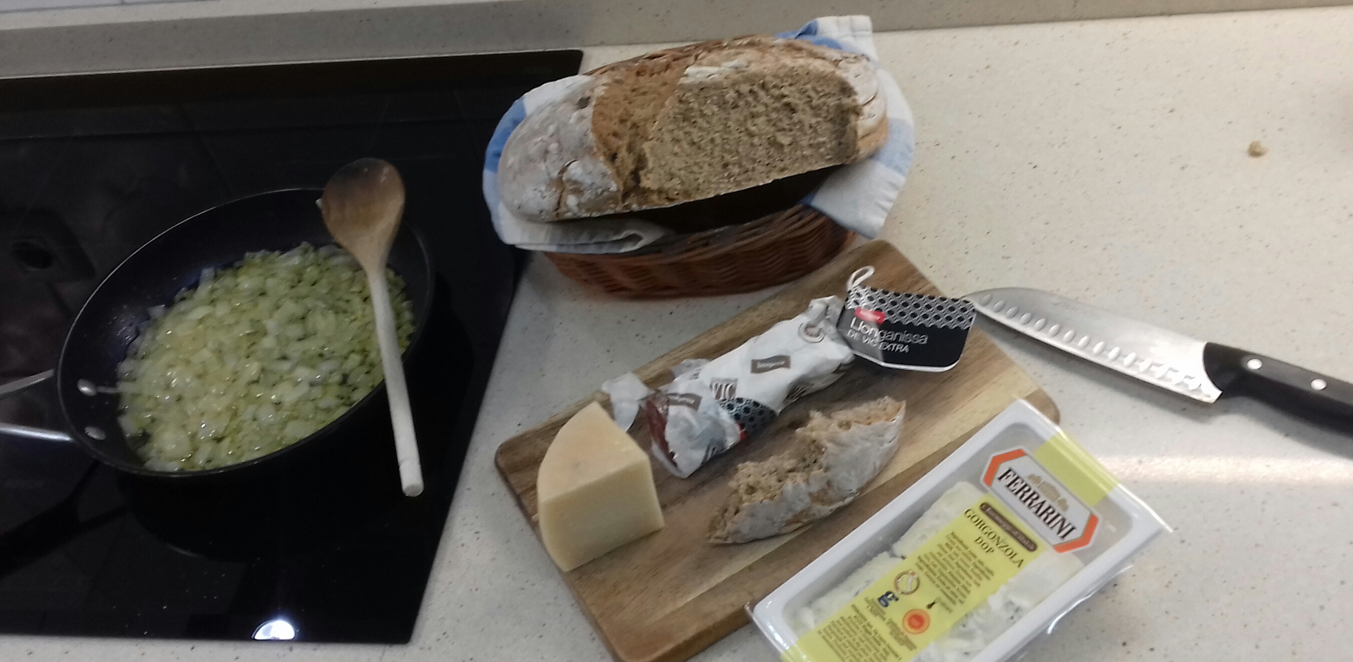 Idiazabal del güeno, gorgonzola y longaniza, y mi pan.