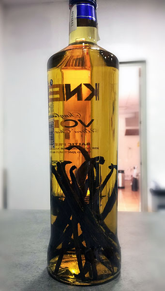 Una vez las has rajado y abierto, las metes en un litro de vodka y lo dejas infusionar todo entre dos semanas y un mes, moviendo la mezcla una o dos veces al día.