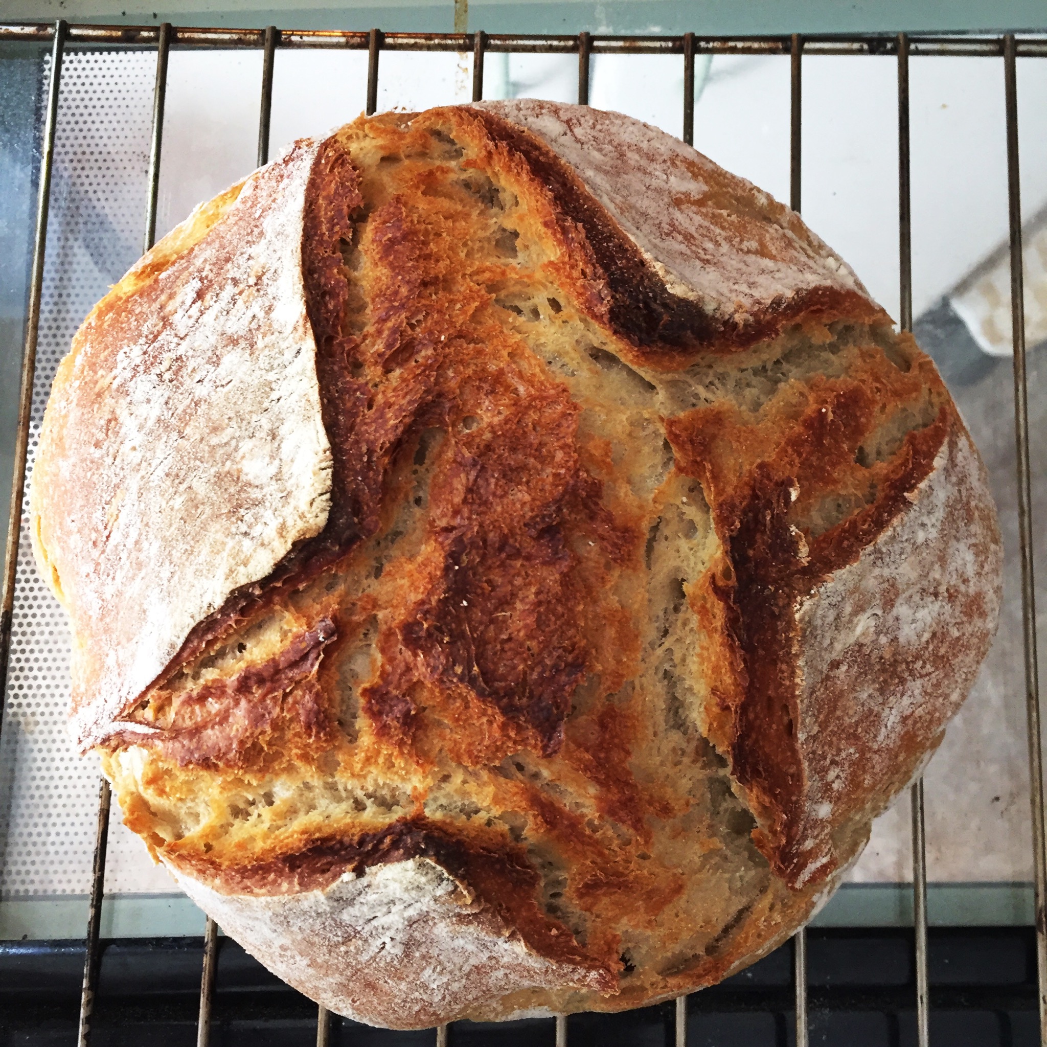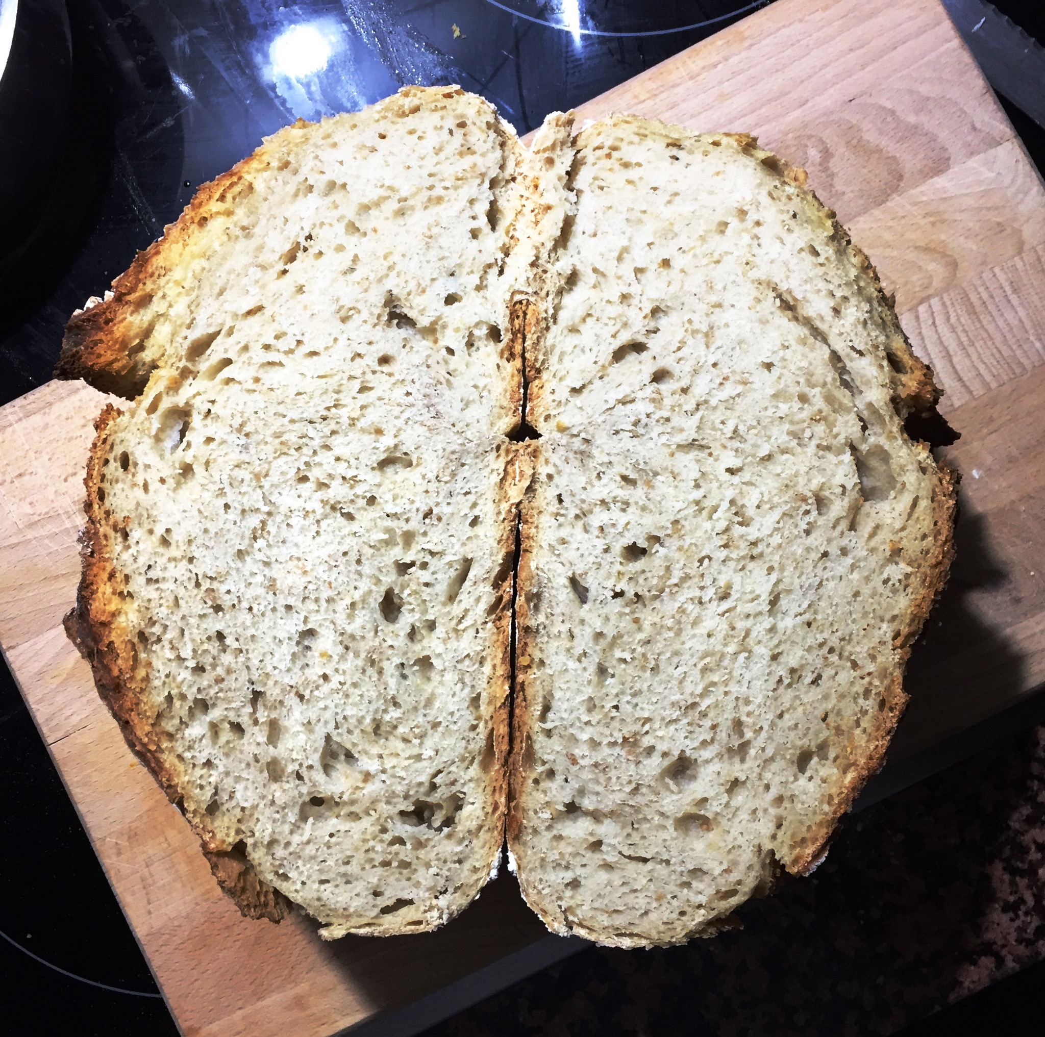 50 gramos de masa madre, cuando enfríe veremos la miga. Esta vez le he hecho greñas.