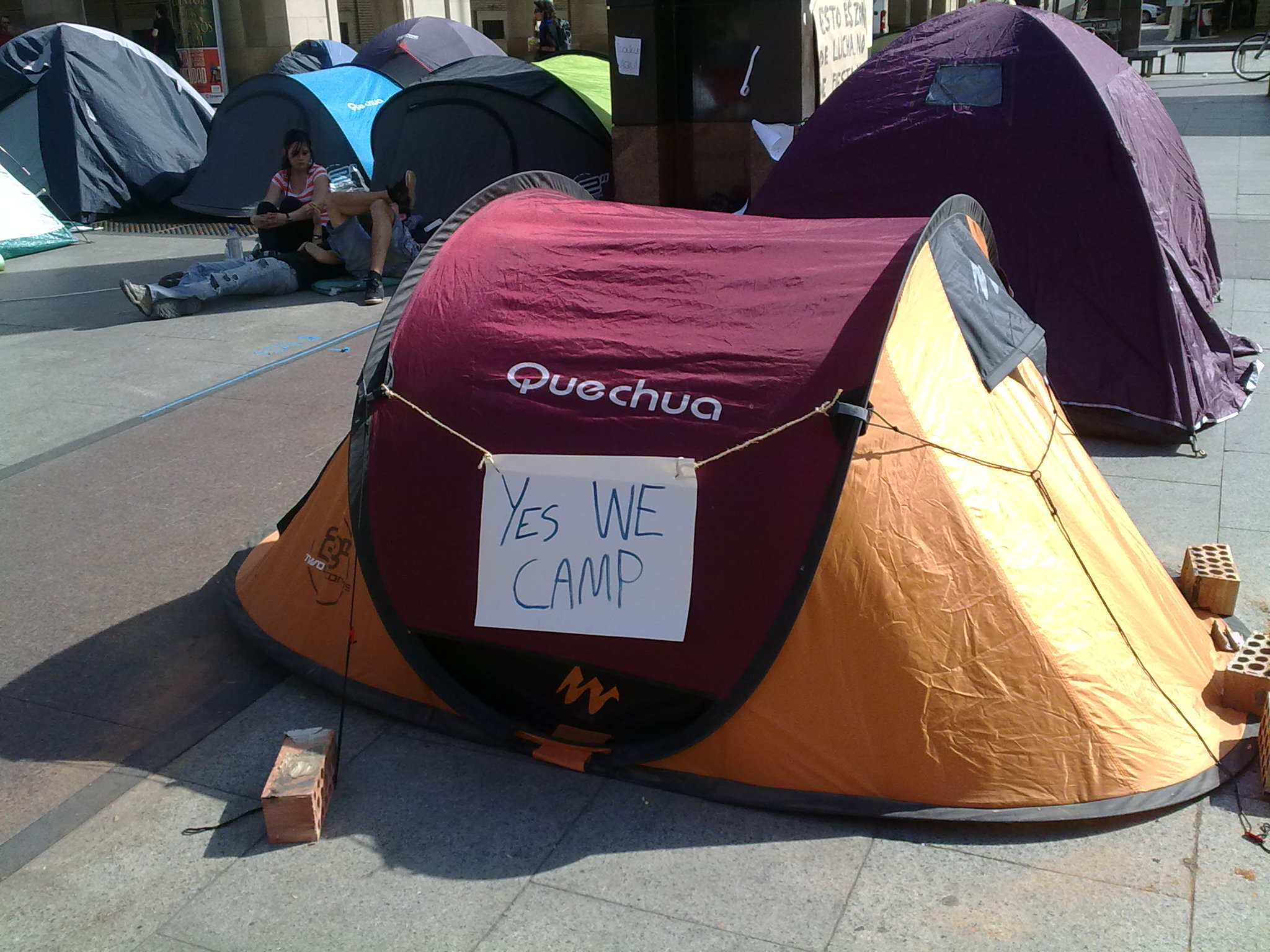 He estado esta tarde en la plaza del Pilar, Zaragoza, y había unas 20-30 tiendas de campaña, y unas 200-300 personas. He tenido que irme por ahí las 19h, que era cuando empezaba a llegar toda la gente, pero vamos que me ha gustado lo que he visto. Carteles de "esto es una protesta, no un botellón", por si a alguien le diera por montarla, cajas para reciclaje improvisadas, brigada de limpieza, gente informando de lo que está pasando, teatro, asambleas... todo como muy civilizado y ordenado.