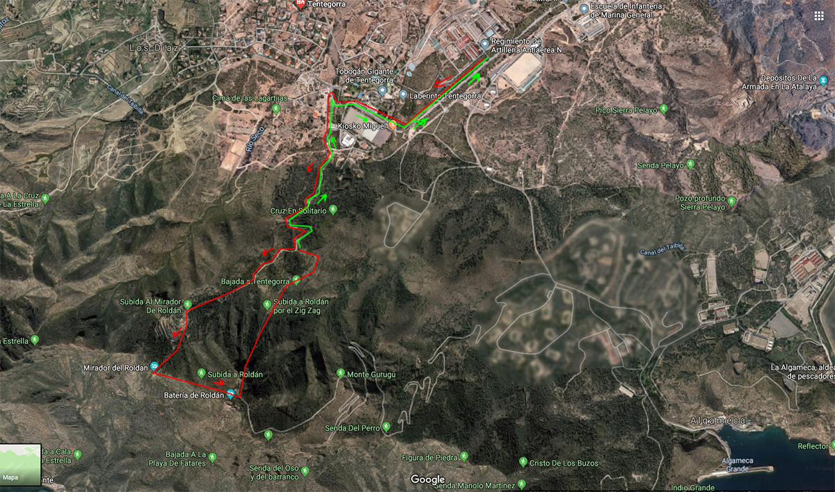 No hice esa ruta muchas veces, me las llegué a ingeniar para escaquearme siempre que podía, la ruta a seguir es la marcada en rojo a paso ordinario y marco en verde la ruta de vuelta, que es la misma a partir de ese punto pero a paso ligero/trote cochinero:
