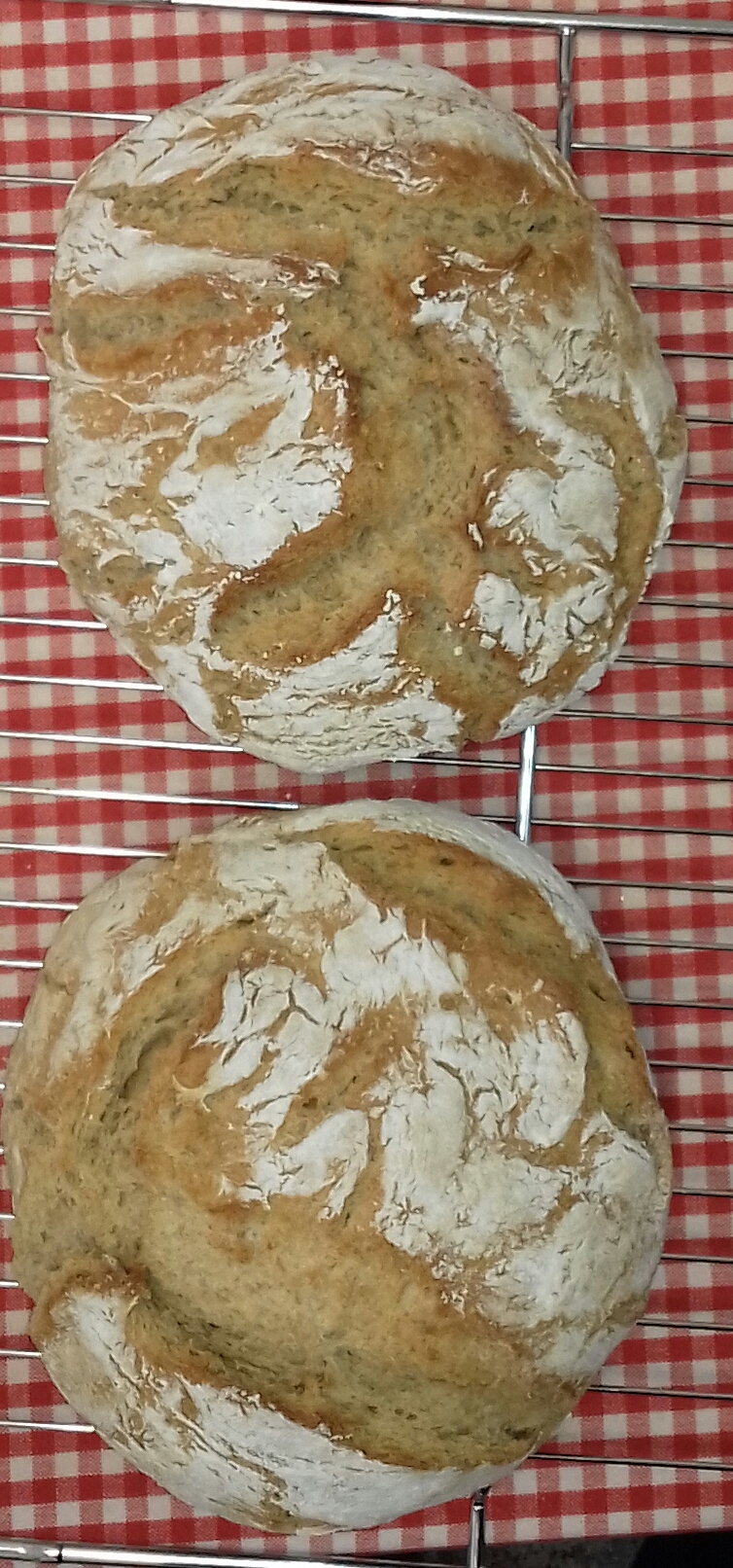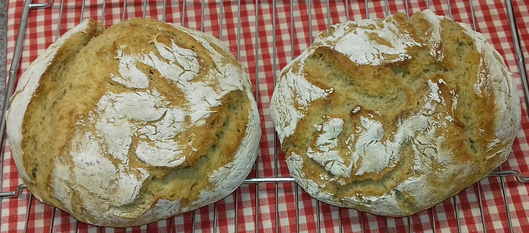 Sin olla, dos mitades de 500 gramos juntas, horno un poco más fuertesito que las otras veces (todo el rato a 220 grados) y un poco más rato. Levadura de sobre.
