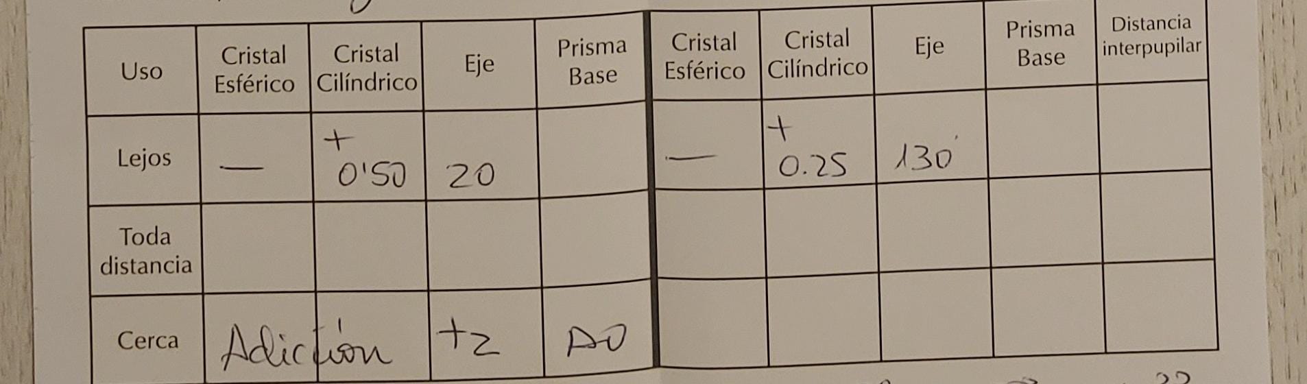 Adjunto el papelito de la oftalmóloga. Si no entendí bien tengo muy poca ceguera pero ya que me manda gafas para cerca por pasar de los 40, me recetaba las progresivas y así también me servían para lejos también. Yo realmente no suelo tener problemas para ver desde lejos, aunque es verdad que ya no veo los carteles lejanos como los veía antes. La explicación que me dio la señora es que al tener progresivas esto me ayudaría en las distancias medias, considerando el pc de sobremesa distancia media. No sé si esto es una gilipollez, intuyo por tus palabras que igual sí, pero yo suelo hacer caso a los médicos.