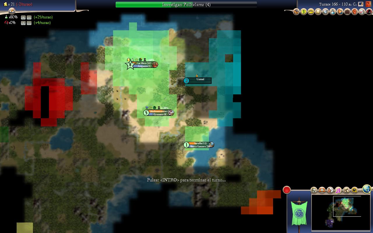 Lo dejo en el 166. Como veréis en el mapa, en cuanto Soralla crezca un poco cortaremos el paso a los putos mayas y los putos ingleses (a los que por cierto también debemos negar la apertura de fronteras). La próxima ciudad deberíamos hacerla al sur, donde la península por donde ahora mismo está avanzando el puto holandés.