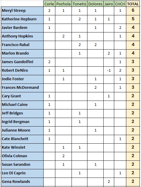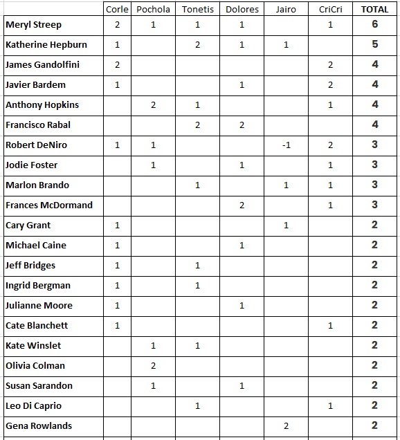 Hemos votado a 70 personas diferentes, y como anécdota decir que la única persona a la que no conocía (al menos, de nombre) es Delphine Seyrig, a pesar de que wikipedeo y veo que sí que he visto dos pelis suyas, "El discreto encanto de la burguesía" de Buñuel, y "Chacal".