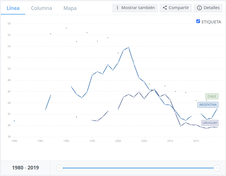 Estos están un poco rancios, son de 2013; dan una idea general de cómo sería la cosa, sin la pandemia y otras desgracias. PBI vs Gini de los países en cuestión, y otros para dar contexto