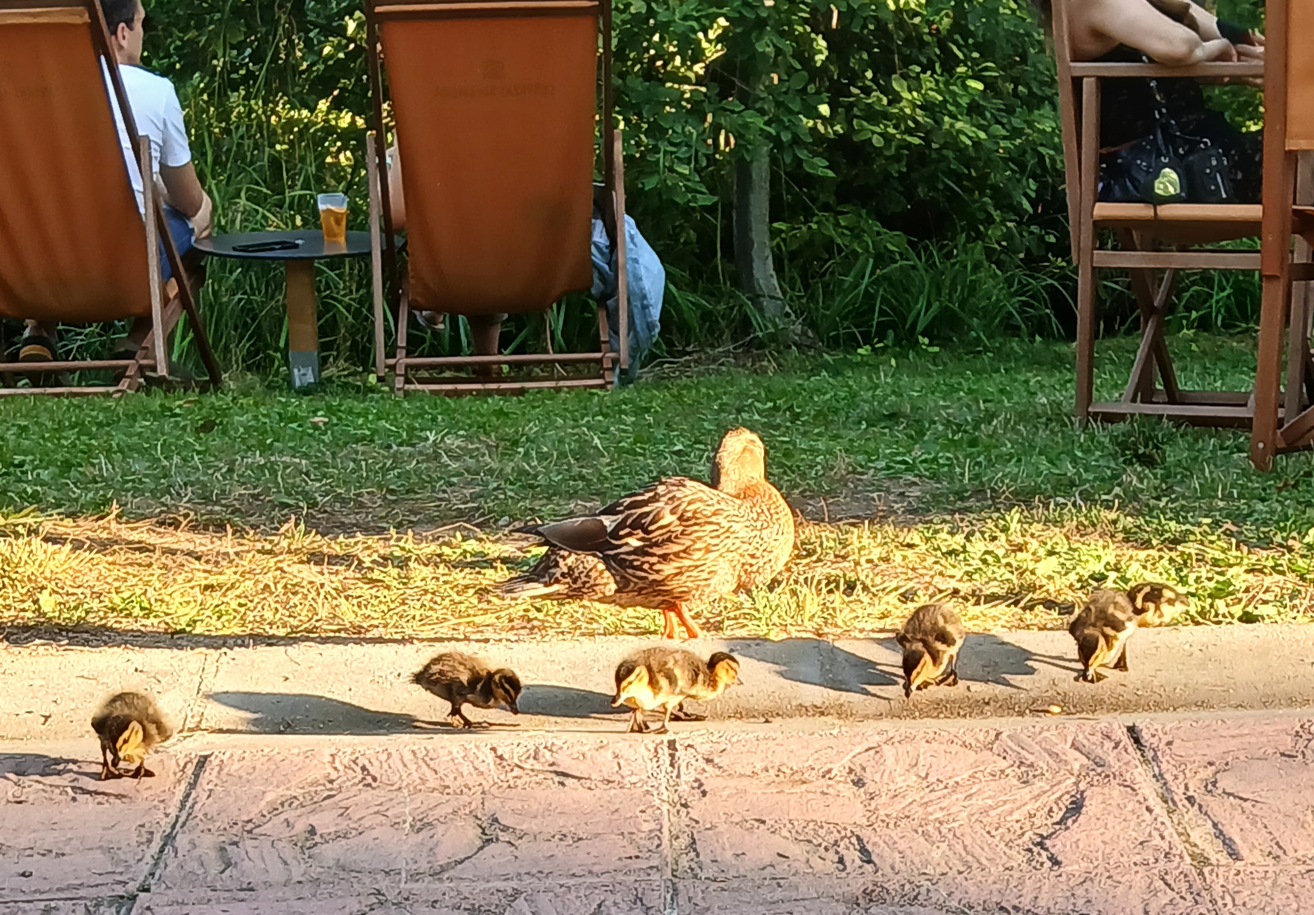 Mamá Pato y Patitos dándo un paseo (y refrescándose en cada charco que veían cerca de una fuente bastante solicitada) en el encantador paraje donde se celebran las Noches del Botánico. En concreto esto fue el jueves a eso de las 21:00, con una hamburguesa en una mano y un vaso de rica y frejquita cerveza en la otra esperando a que empezasen los siempre elegantes Air. No queráis saber con qué saqué la foto, claro.