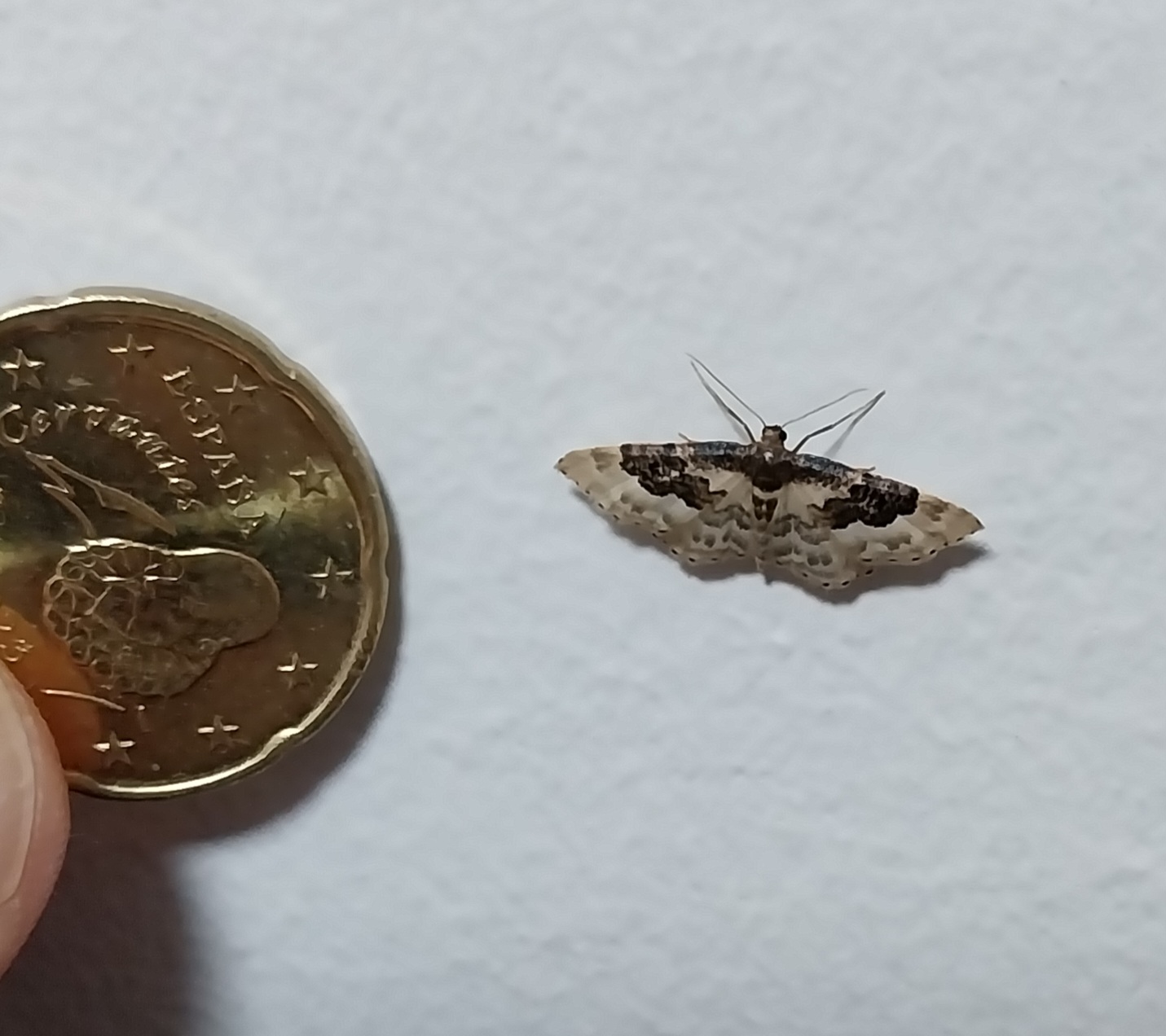 Idaea rusticata en mi cuarto, junto a una moneda de 20 céntimos: