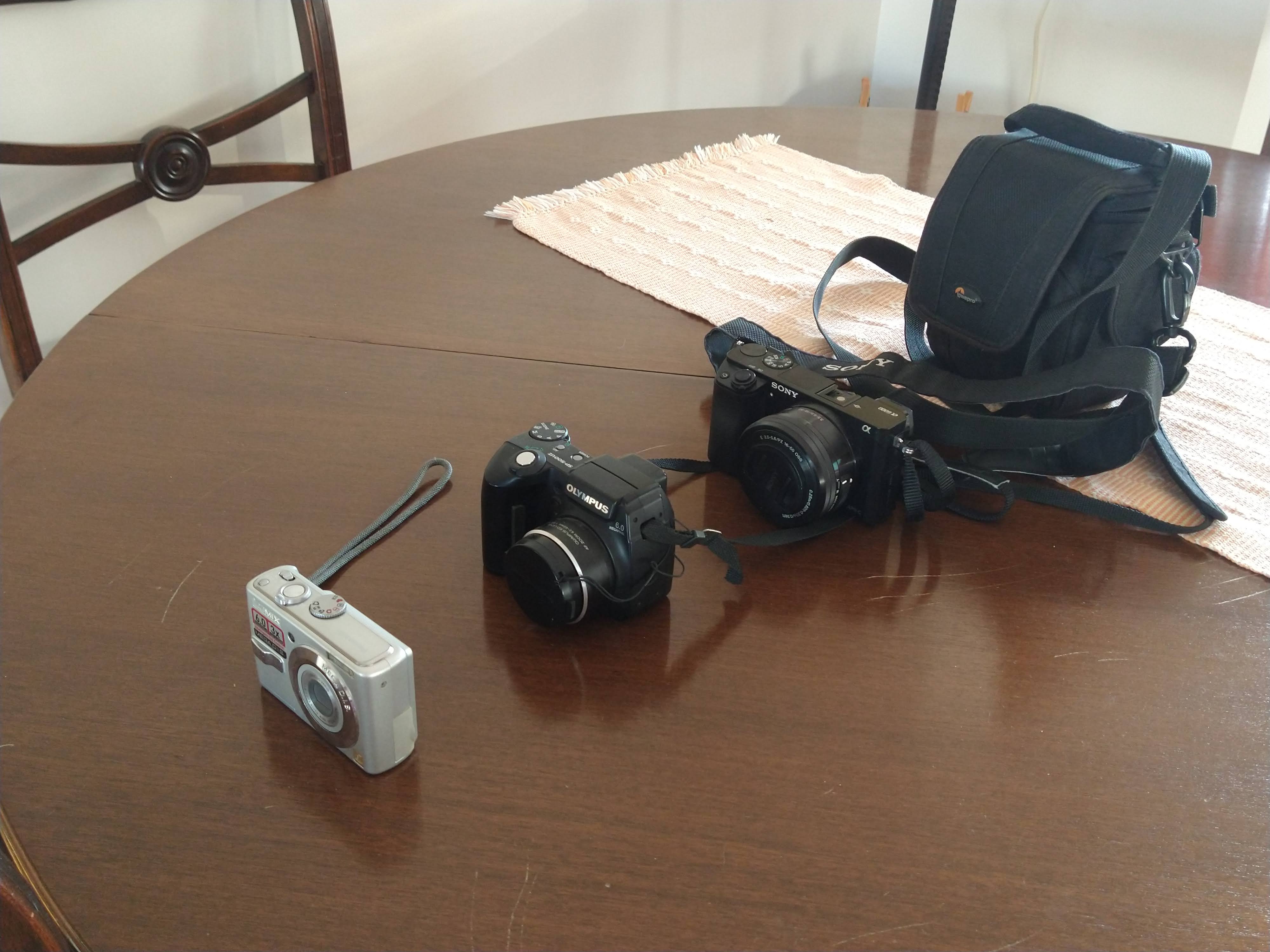 Estas son mis cámaras. La primera es lo que yo llamaría compacta, la segunda ya me es raro pero ponele; la tercera es de lentes intercambiables pero no es el bodoque que son las réflex. Todas entran en el estuche de atrás (salvo que la última tenga el tele). Los arañazos son de los gatos.