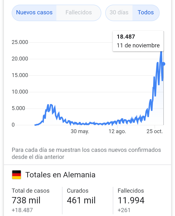 Tampoco es que en Alemania estén como para presumir mucho, porque la segunda ola también les está agectando.Ruttiger escribió: ↑12 Nov 2020 11:03 Mi reciente experiencia en Alemaña es que no solo no se usa nunca al aire libre (en interiores siempre) sino que además tampoco son muy escrupulosos con la distancia social: parques públicos llenos, terrazas, parque infantiles repletos de niños con cuatro progenitores por banco...