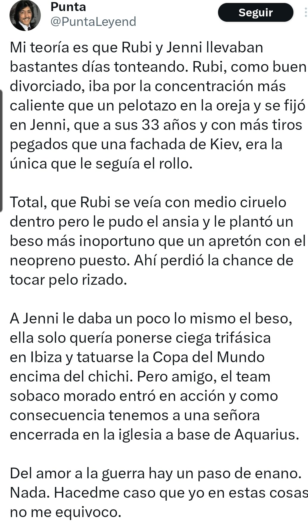 Que una víctima de lo que sea, haga chiste sobre el suceso que acaba de sucederle (además en el contexto de que esa víctima es una recién faking Campeona del Mundo, con todos los chorrazos locos de serotonina, adrenalida, oxitocina, etc que embriagan su cuerpo, más unos cuantos decilitros de alcohol), no le quita ni un ápice de gravedad al suceso, ni rebaja en lo más mínimo el hecho delictivo, en caso de existir (que lo tendrá que decidir un juez, finalmente).