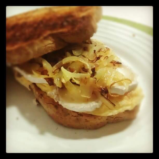 Un clásico: tortilla francesa, brie y cebolla pochada. Entre rebanadas de rústico tostadas.