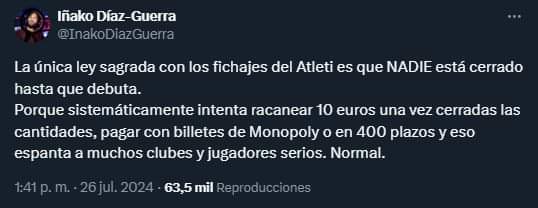 Lo malo: el Atlético, tras lo de hoy, está a cero en fair play, por lo que quien venga tiene que ser sí o sí tras la salida de alguien.