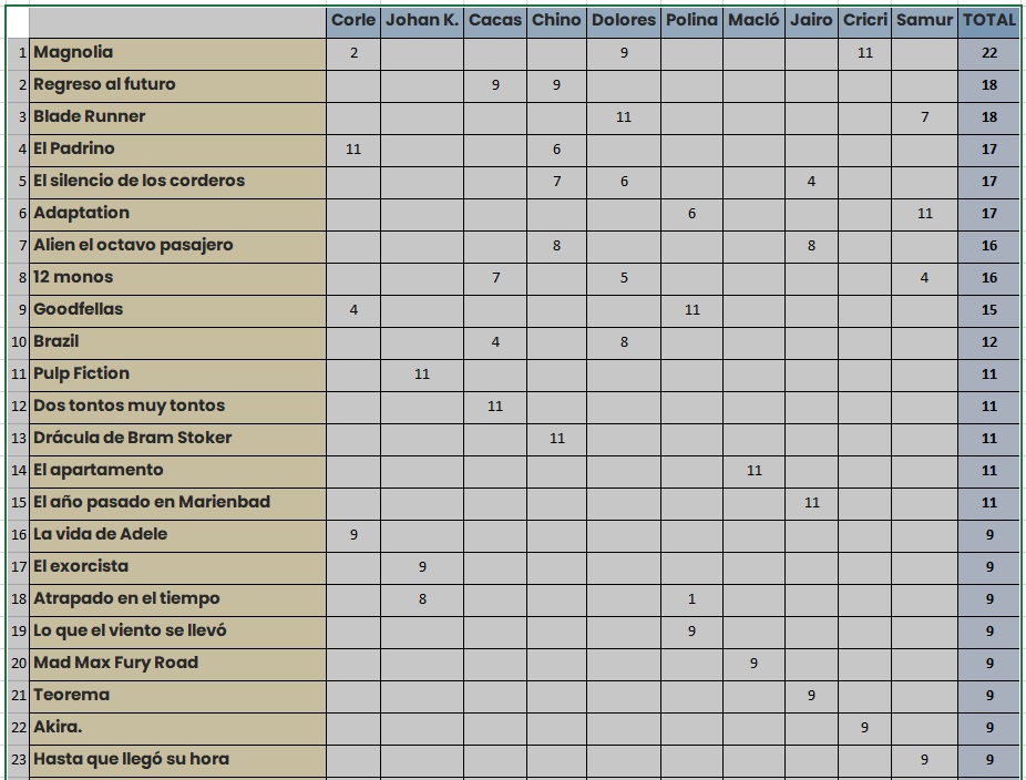 Anímense, aún hay tiempo para votar (@Corvux corax, queremos tu delirante selección), una vez que vea que ya no vota nadie más, haremos EL GRAN CORTE, y pasaremos a una segunda vuelta en la que solo se podrá votar a las películas que queden en los ¿25? primeros puestos en esta ronda inicial.