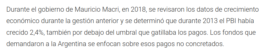 El cupón atado al PBI se usó como anzuelo para atraer a la mayor cantidad de bonistas posibles al canje de deuda que se hizo en 2005. Este instrumento financiero se les paga a los bonistas cuando la Argentina crecía más de 3% en el año. La demanda contra el país se basó en el cambio en la base del cálculo del nivel de la economía (PBI).