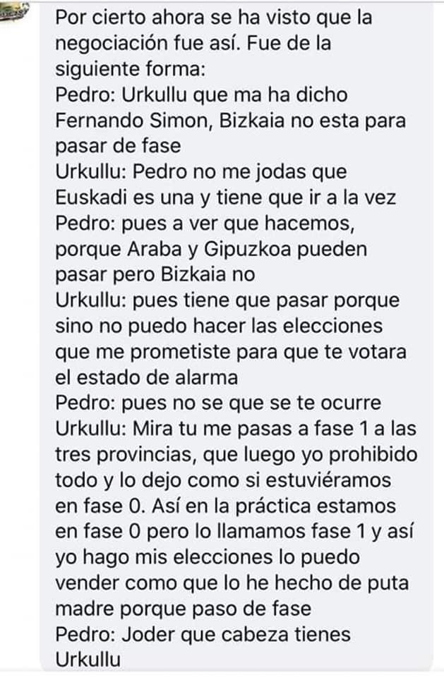 Para quien no pille el contexto, en Euskadi estamos en Fase 1, pero tan "capada" por el Gobierno Asco que las diferencias con la fase 0 son básicamente que han abierto algunas tiendas.
