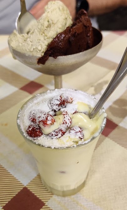 De postre tremendo helado de Pistacho y pocholate, y un postre de mascrpone (creo) y unas fresitas pequeñas que me cago en mi puta vida.