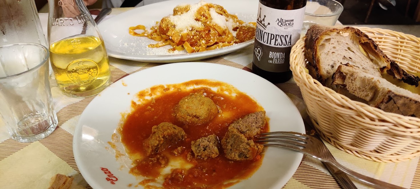 Aquí decidimos tirar por un plato tradicional, Cacio e Pepe, y por algo un poco más loco, una pizza ( Pinsa, realmente, los romanos hacen una pizza decente pero a años luz de las napolitanas) con papas al horno. Ambas cosas cojonudas (Lo siento pero lo mío es el mangiare, no la crítica gastronómica)