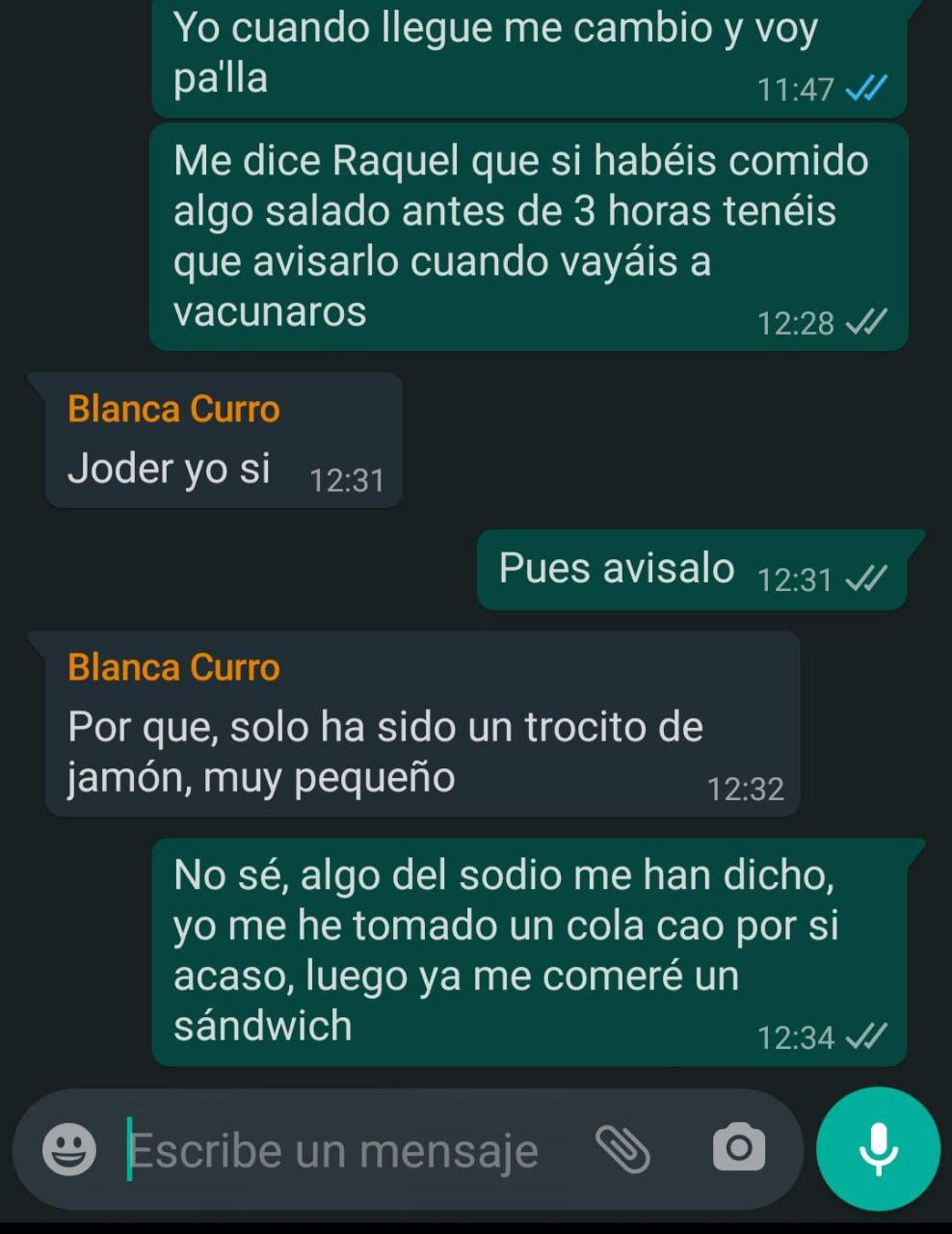 En fin, yo al ser alérgico a uns proteinas me tuvieron que vacunar un par de semanas más tarde en Alergología, cuando llegué menudo cuadro, gente desmayandose porque iban en ayunas desde la cena y nerviosa (la vacuna fue a las 10 de la manana, médico y enfermeras flipaban porque decían ¨Quien cojones os ha dicho lo de venir en ayunas y lo de la sal¨