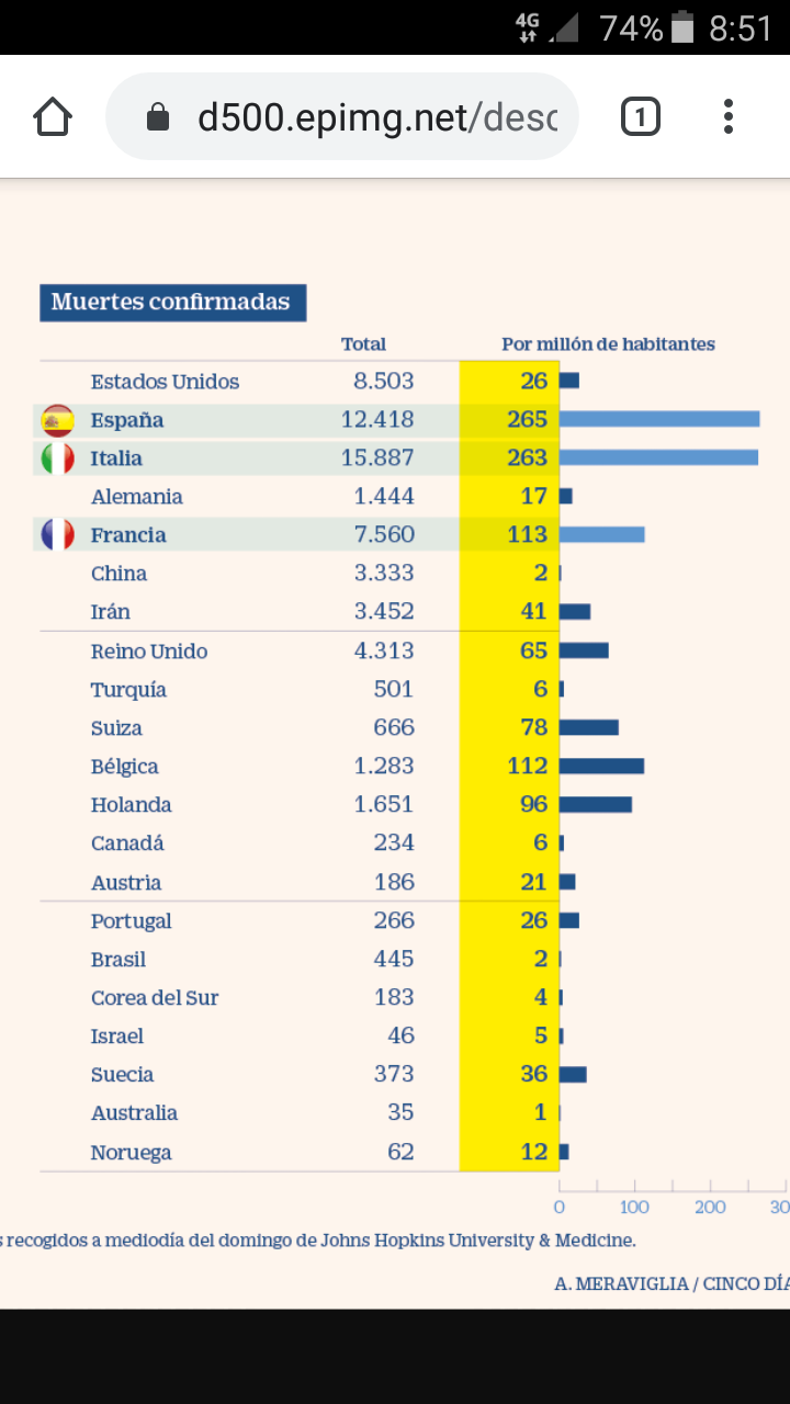 Por fin veo el dato que pone en relación los muertos y el tamaño (población del país) y, oh, chorprecha, somos los que más muertos/millón tenemos en TODO el mundo. Claro que esas cifras de muertos de China no se las cree ni el Tato...