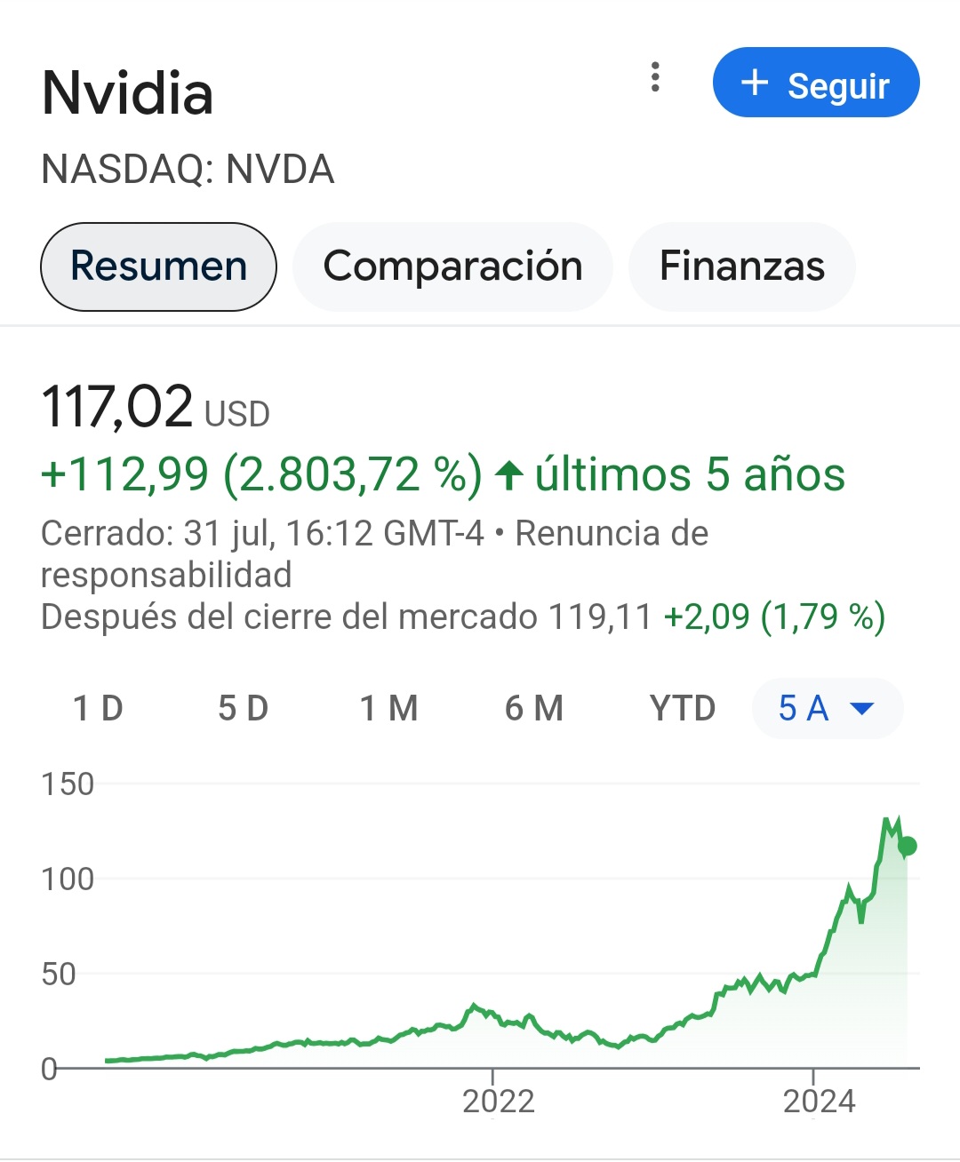 Sí, eso lo sé, ha subido la hostia los últimos años, pero esta última caída ha sido por valor de un billón de dólares. No un billón americano, que son mil millones, sino un billón nuestro, lo que ellos llaman un trillón. A mí me preocuparía, aunque las acciones estuvieran mucho más altas que hace cinco años.M. Corleone escribió: ↑31 Jul 2024 22:13No ha sido para tanto la caída para quien invirtiera hace tiempo: